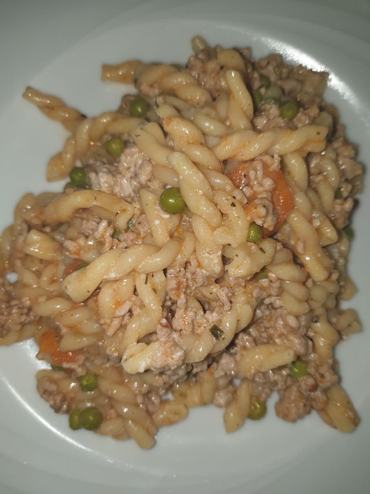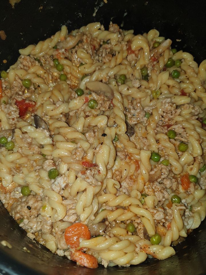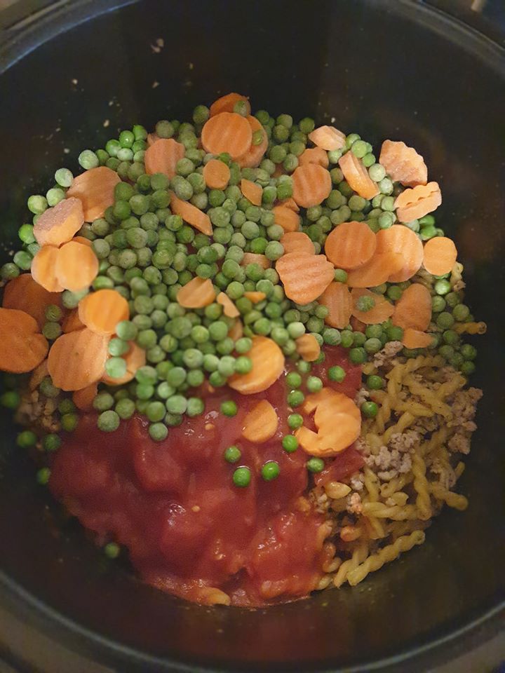 🔹 Dann die rohen Nudeln dazu, Champignons, gehackte Tomaten, Gewürze, Erbsen und Möhren sowie ein paar Kräuter