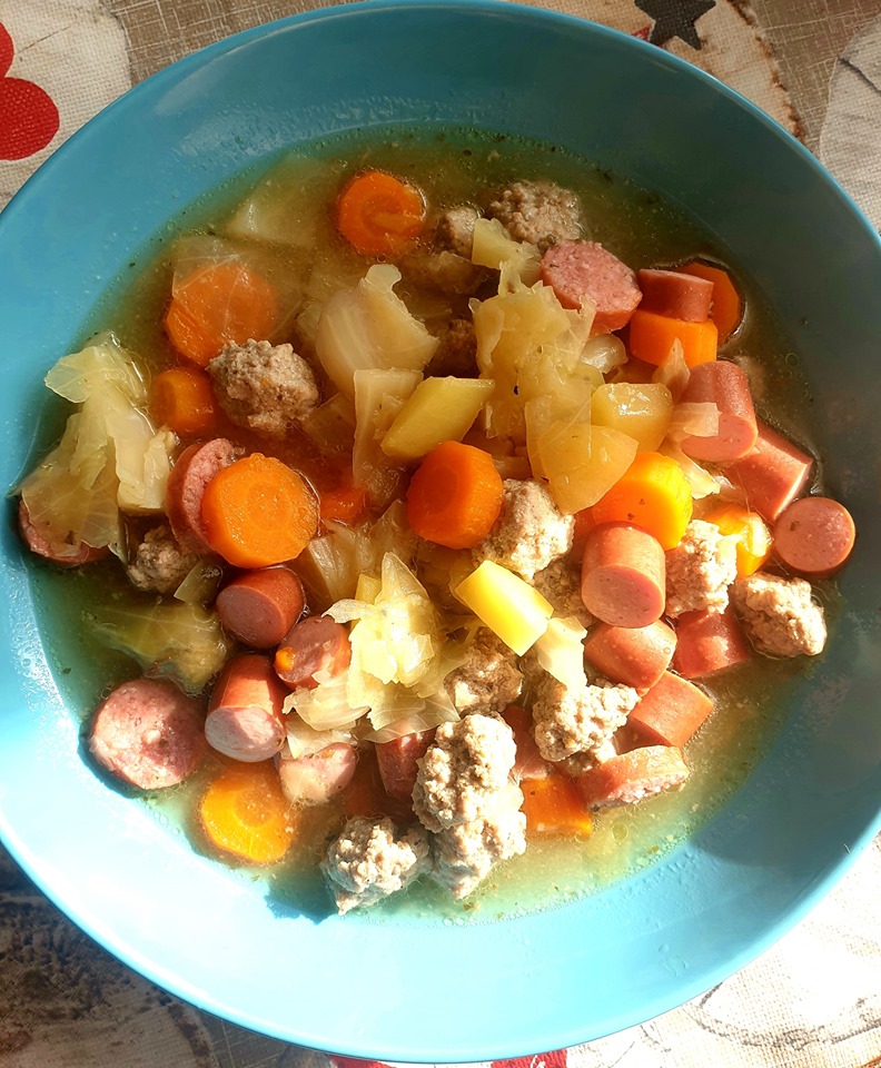 🔹 Mettbälle in die Suppe tun und mit den kleingeschnittenen Würstchen / oder ganze wie ihr mögt ca 10 min ziehen lassen