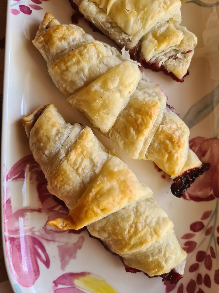 ▪ Fertig Blätterteig einfach in Dreiecke schneiden, reste davon können nach belieben auch gebacken werden